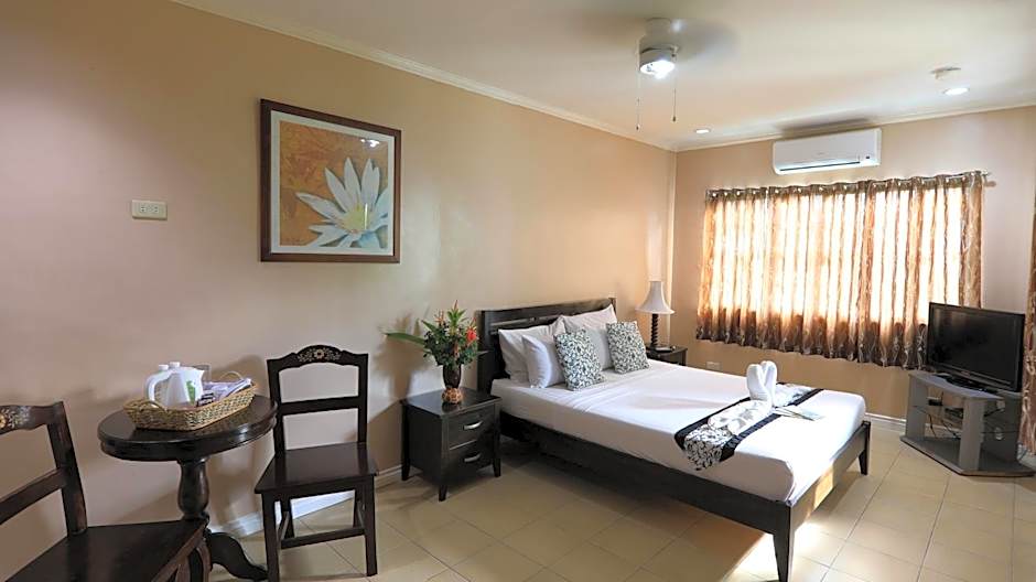 Larger air-conditioned room with a king-sized bed features a flat-screen cable TV. Private bathroom includes a hot and cold shower.